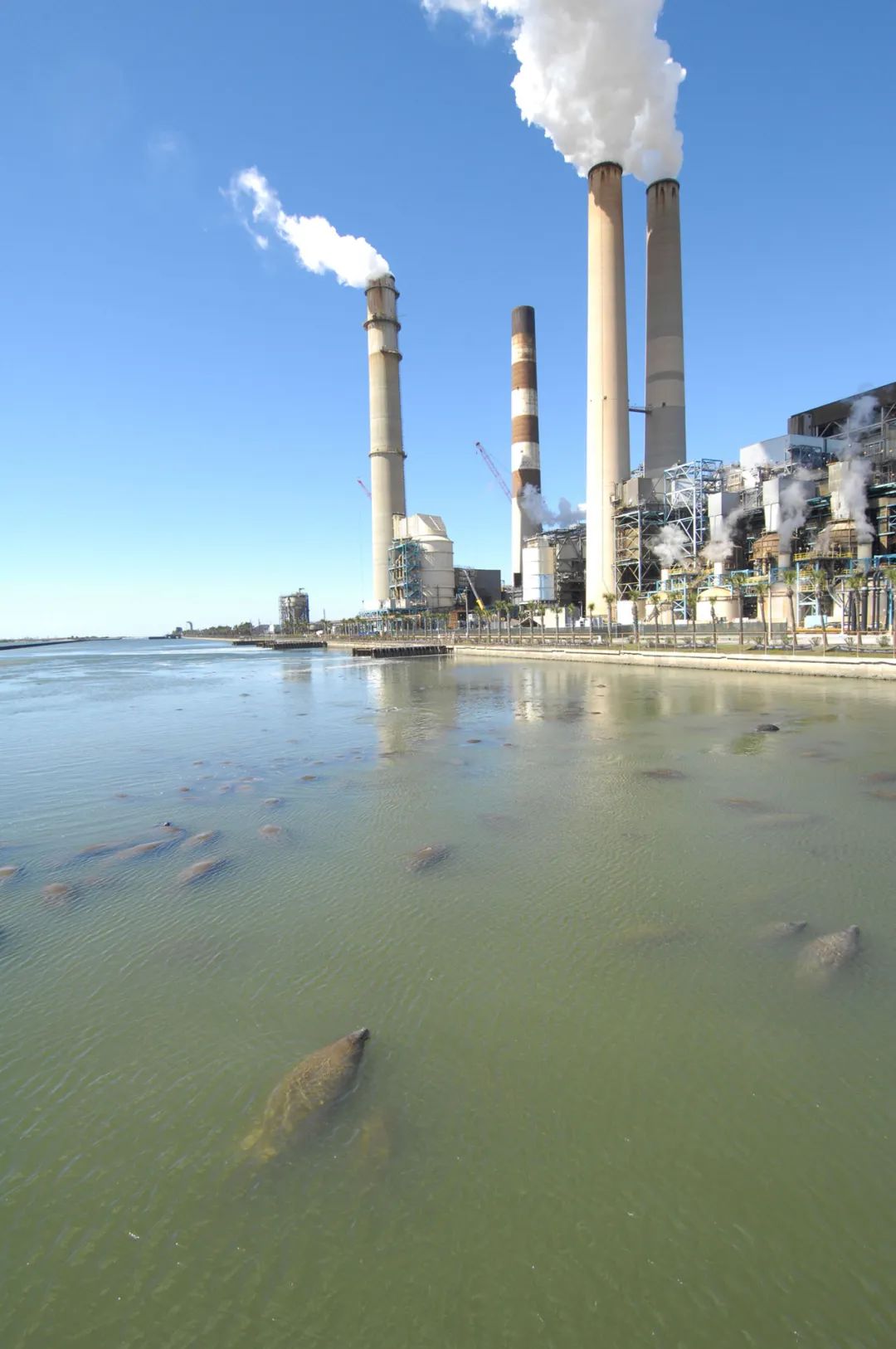 海域水体富营养化是赤潮发生的直接原因(图片来源:NASA)不过作为自然界中的X因素,人类和海牛之间的关系也非常复杂。在美国,人们发现海牛非常喜欢在发电厂附近游荡,这是因为发电厂会把高温冷却水排入海洋,导致海域的温度上升。而对于希望温暖的海牛来说,这就非常有吸引力了。因此在佛罗里达州的大拐弯发电厂(big bend power station),甚至成为了观赏海牛的绝佳景点。