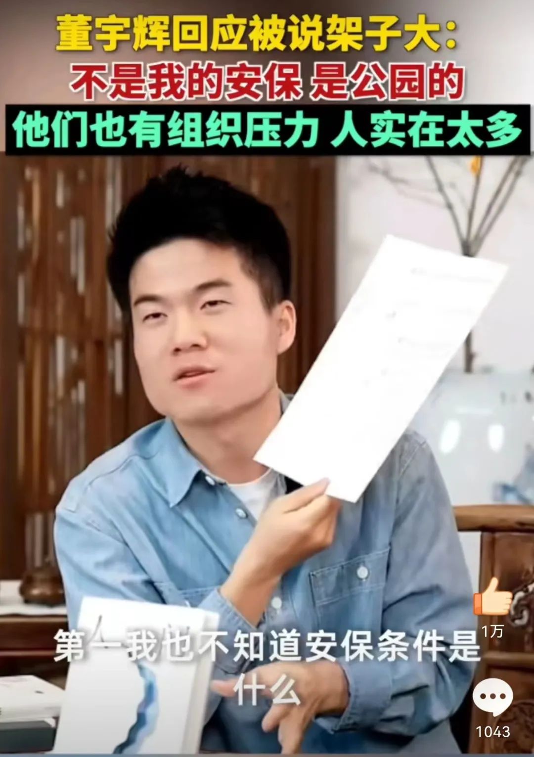 3月26日,董宇辉在直播时谈及湖北行的网络争议和批评,回应了公园安保情况。对于一些网友说的“架子大”,他表示这并非自己的安保人员,而是公园的,在现场也曾劝过,但不能抛下一切去阻挡。董宇辉称:“他们也有组织的压力,人实在是太多了,没办法。”