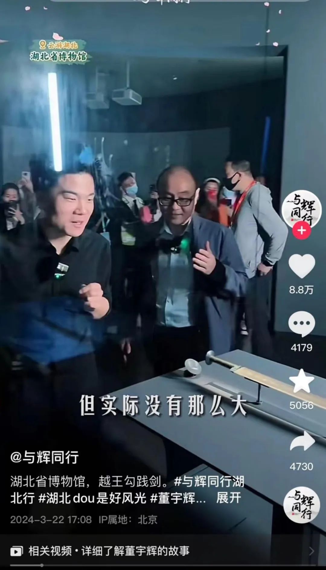 湖北省博物馆是8家中央地方共建国家级博物馆之一、国家一级博物馆、国家5A级旅游景区,展出文物2.5万件以上。公开报道显示,董宇辉的湖北省博物馆之行,相继参观了曾侯乙、越王勾践剑、楚国八百年、梁庄王珍藏展四大展厅。另据媒体报道,该活动是湖北省文旅厅主办,与“与辉同行”团队合作的活动。