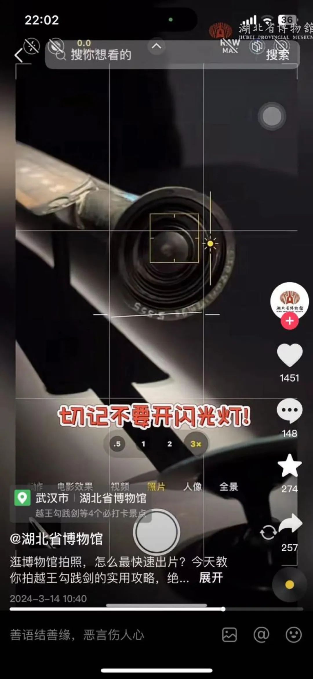 3月23日,湖北省博物馆在短视频平台发布的视频显示,董宇辉团队在参观时,使用多个补光灯棒补光,而湖北省博物馆3月14日发布的另一则短视频则强调,“切记不要开闪光灯”。