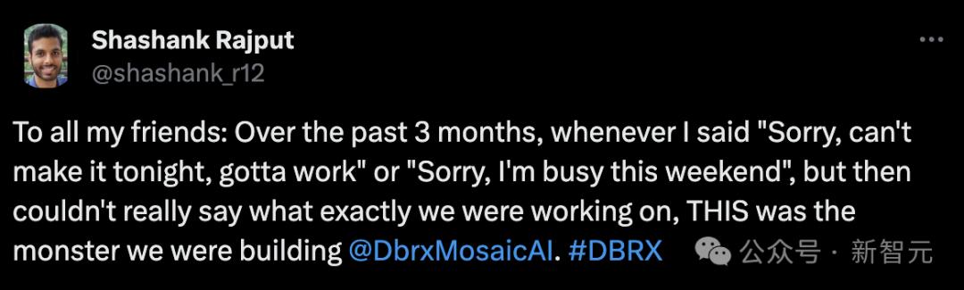而Databricks的员工激动地表示,过去3个月,朋友们周末约我都说「不行,这周不行我有事,但是又不能说有啥事」的日子终于结束了,DBRX就是我们加班加点搞出来的一头「怪兽」。