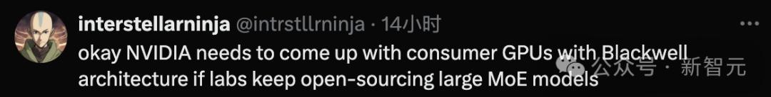 还有网友表示,「如果实验室继续开源大型MoE模型,英伟达可能就需要推出最强Blackwell架构的消费级GPU了」。