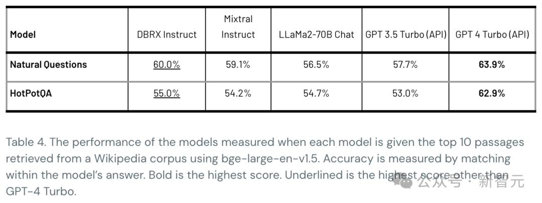 表4显示了DBRX在两个RAG基准测试——Natural Questions和HotPotQA上的质量。