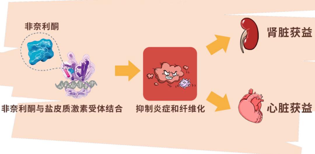 作用机理:它通过阻断盐皮质激素受体(MR)过度激活,抑制炎症和纤维化,降低肾小球高压和高滤过,降低尿蛋白,从而延缓肾病进展,还可以保护心脏,降低心血管事件风险