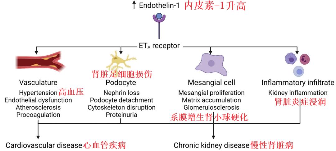 作用机理:安立生坦是一种内皮素受体拮抗剂(ERAs),内皮素-1与受体(ETA)结合后会导致血管收缩、血压升高,促使炎症因子表达,损伤足细胞,加速肾脏纤维化,并最终导致蛋白尿和肾功能丧失。安立生坦可以阻断内皮素与内皮素受体的结合,通过这种机制减少肾脏损伤,实现肾脏保护