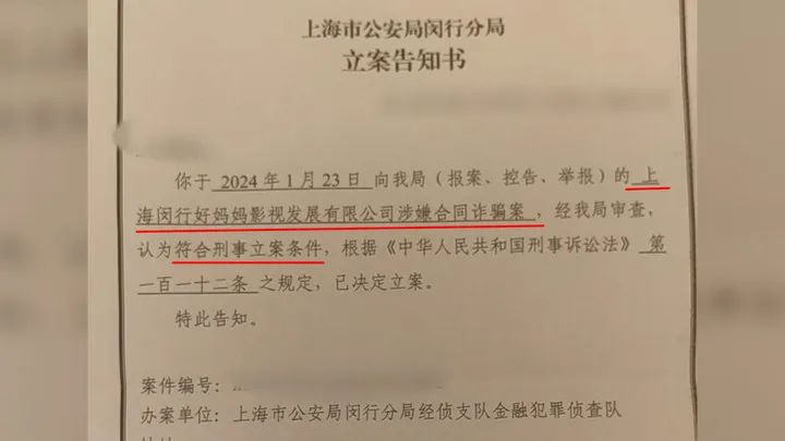 3月21日,上海市公安局闵行分局向王玲寄出《上海市公安局闵行分局立案告知书》,文件内容显示:你于2024年1月23日向我局(报案、控告、举报)的上海闵行好妈妈影视发展有限公司涉嫌合同诈骗案,经我局审查,认为符合刑事立案条件,根据《中华人民共和国刑事诉讼法》第一百一十二条之规定,已决定立案,特此告知。