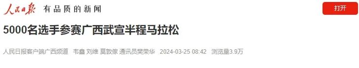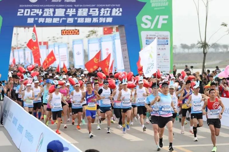 3月24日上午,2024年武宣半程马拉松暨“奔跑吧广西”路跑系列赛在广西来宾市武宣县市民广场鸣笛开跑。来自全国各地的5000名参赛选手共赴武宣,用一场酣畅淋漓的奔跑,体味仙城“一江一湖”的旖旎风光与“魅力古城”的深厚底蕴,跑出全民健身“加速度”。