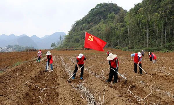 2024年3月25日,在广西来宾市忻城县大塘镇金山村,忻城县文化广电和旅游局党员干部志愿者服务队在帮助困难群众种植甘蔗。春耕时节,广西来宾市忻城县组织党员干部深入各乡镇村屯田间地头帮助群众解决春耕生产中的实际困难和问题,在劳动中和群众拉家常、话农事,进一步拉近了党员干部与群众的距离。