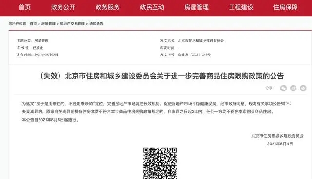住建委官网显示,上述政策发布日期为2021年8月4日,文件名为《北京市住房和城乡建设委员会关于进一步完善商品住房限购政策的公告》,目前文件显示“失效”。