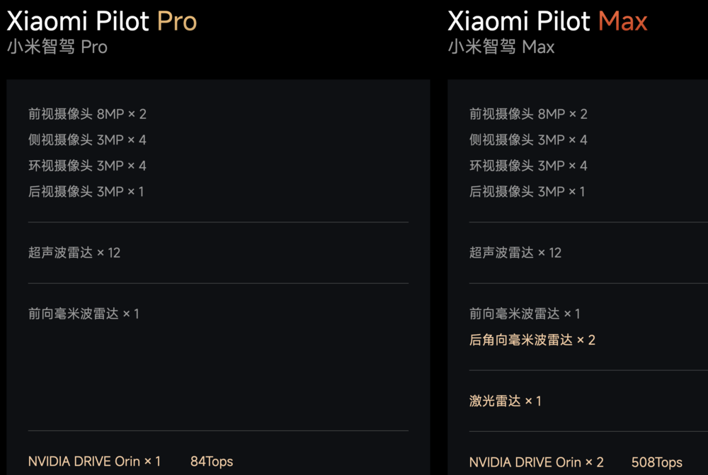 算力层面,硬件上,小米SU7Max版搭载了两颗英伟达 Orin-X 芯片,车端算力达到508TOPS,在行业里属于绝对的高配。不过这个算力暂时在城市NOA上还不足,依然需要依靠芯片能力的升级。