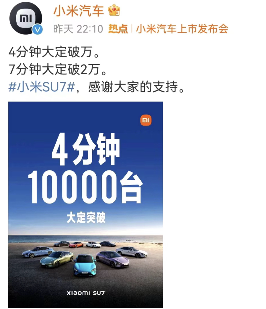 发布会当晚22点,开始支付定金,上市刚4分钟就大定破万,7分钟大定破2万,上市27分钟,大定已经突破50000台。
