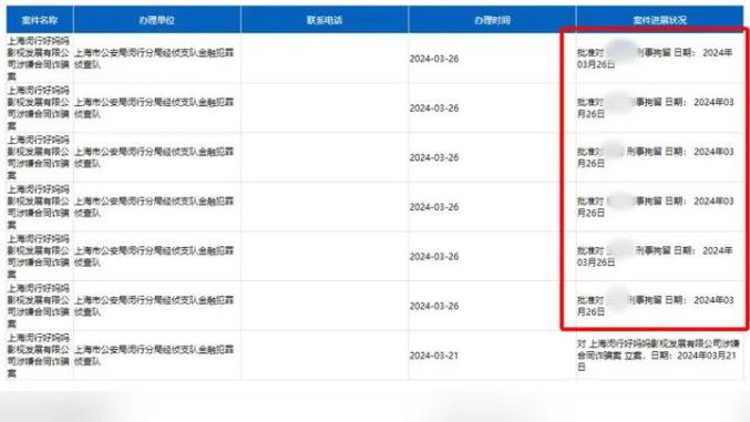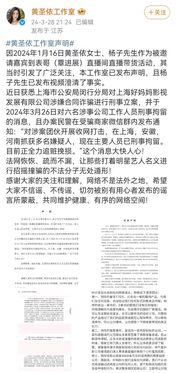 近日,上海市公安局闵行分局向维权商家寄来立案书,并于3月26日对六名涉事公司工作人员刑事拘留。目前该案件共牵涉三场直播,已做并案处理。黄圣依、杨子、李彩桦、麦家琪等多位明星、网红牵涉其中,受骗商家高达200多户,被骗金额约3000多万元。