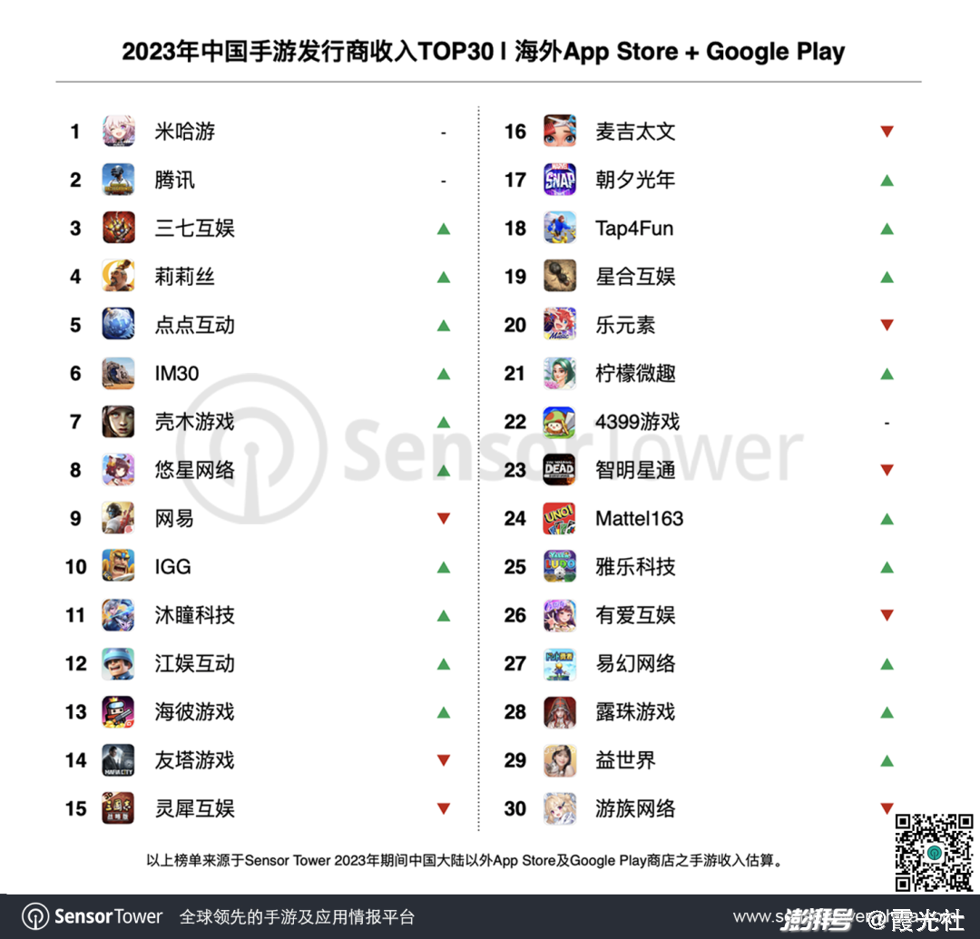 据SensorTower《2023年中国手游发行商收入Top30》,米哈游依然蝉联冠军,这是其位列榜首的第三年。除了《原神》的稳定增长外,去年新发行的《崩坏:星穹铁道》也为米哈游带来了新的增长曲线。