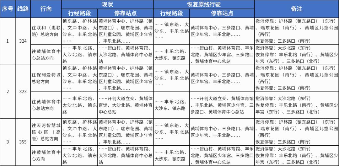 (一)基于目前地铁七号线二期已完成施工,镇东路恢复通行情况,在镇东路(三多路口北侧约50米)恢复设置公共汽车三多路口站(双向),恢复公共汽车323、324、355等线路停靠公共汽车三多路口站(双向)等站点(详见下图)。
