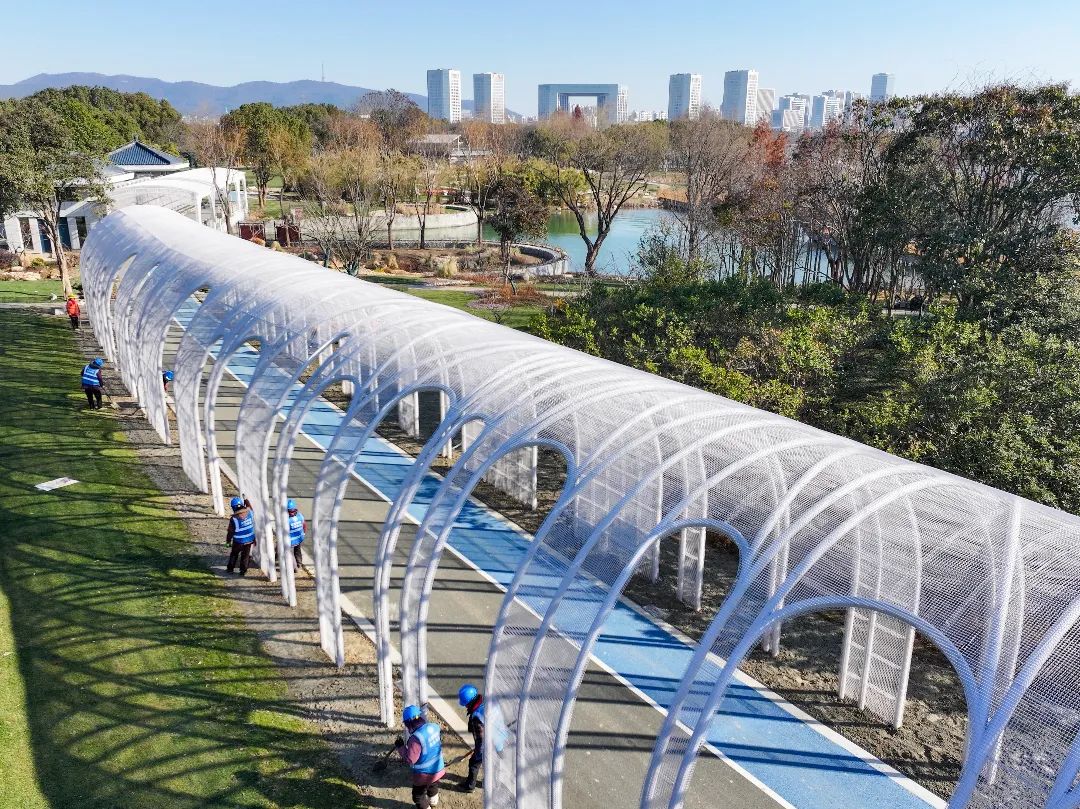 长廊是渤公岛升级后的又一亮点。国内著名建筑设计师俞挺采用“翠屏花障”立意,将现代艺术和生活美学融入山水风景,模拟根、叶、花、果、种的演替,打造四段不同主题的长廊片段,构建出“疏密得宜、曲折尽致、眼前有景”的长廊空间,彰显江南城市湿地公园的独有魅力。