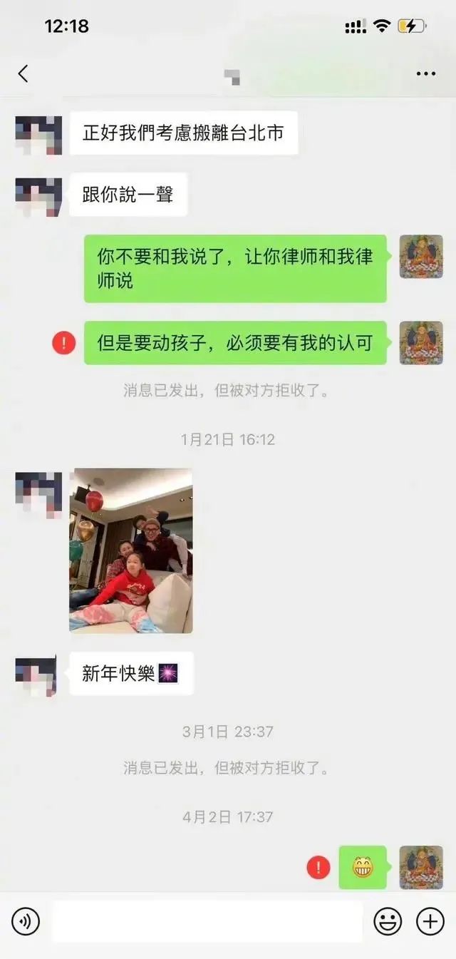 这场闹剧里,最幽默的是汪小菲晒出了一张与大S的聊天记录。记录显示,大S已将汪小菲拉黑,在新年那天却发过去一张全家合照。隔了两个月,汪小菲回复了一个笑脸,只收获了醒目的红色感叹号。