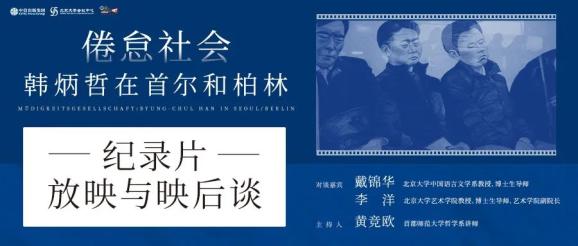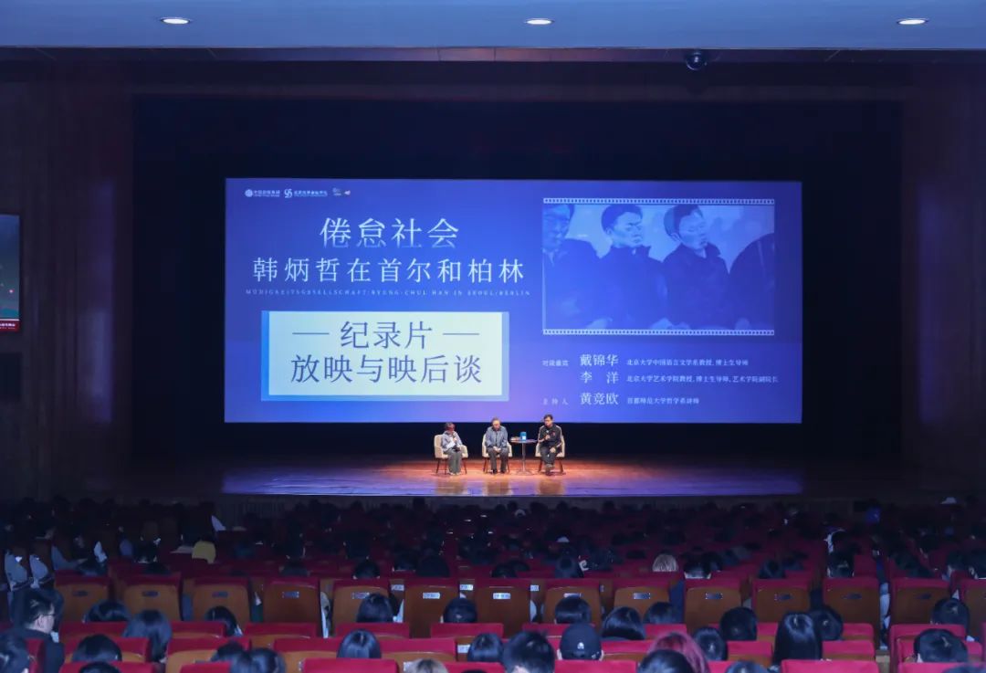 放映结束后,阿信邀请到了既是文化和电影理论的研究者,同时也在不同程度上关注哲学的两位嘉宾:北京大学中国语言文学系教授戴锦华和北京大学艺术学院教授李洋就纪录片与韩炳哲已经出版的中文作品展开了对谈。映后谈由首都师范大学哲学系讲师黄竞欧主持。