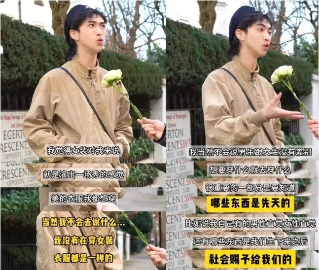 反转来自于恩利的亲自回应。在一则街头采访和他独自录制的视频中,他解答了许多网友对他的疑问。原来,他8岁起就开始搭配自己的每一套衣服,享有绝对的穿衣自由,父母非常支持;原来,他穿女装只是因为喜欢好看的衣服,像表演一场“秀”,他平时依旧穿男装出门;原来,网络上的争议他都看得到,面对质疑也会回怼,世界上还有很多人无法穿衣服,为什么不去享受自由穿衣的权利呢?