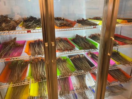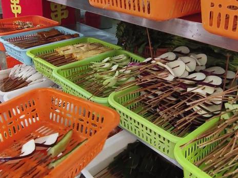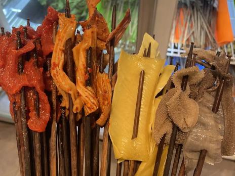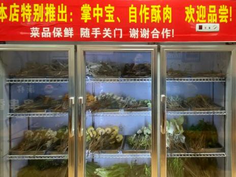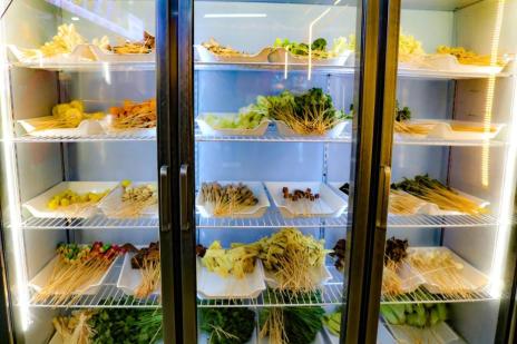 ●味道点评:希辣点点香把各色菜品通过竹签串在一起,摆在冰柜中供食客选择,然后通过厨师大锅快速涮煮,食材熟后被撸下竹签放进大碗,经过精心调味,淋上热油便可以品尝。