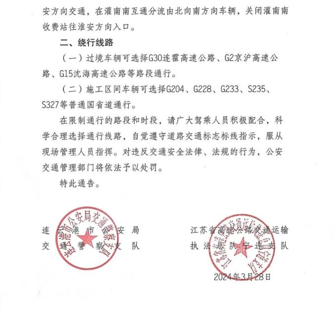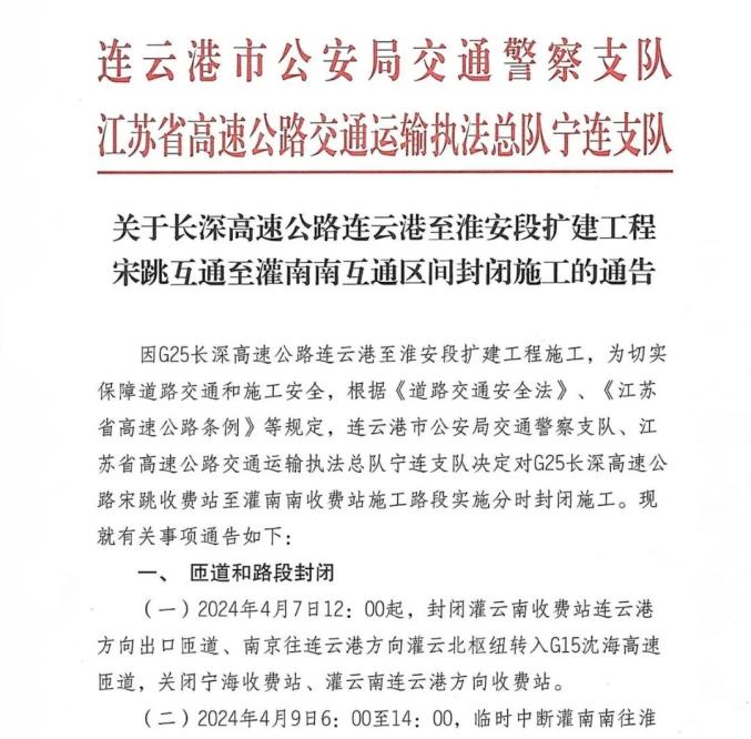 (一)2024年4月7日12:00起,封闭灌云南收费站连云港方向出口匝道、南京往连云港方向灌云北枢纽转入G15沈海高速匝道,关闭宁海收费站、灌云南连云港方向收费站。