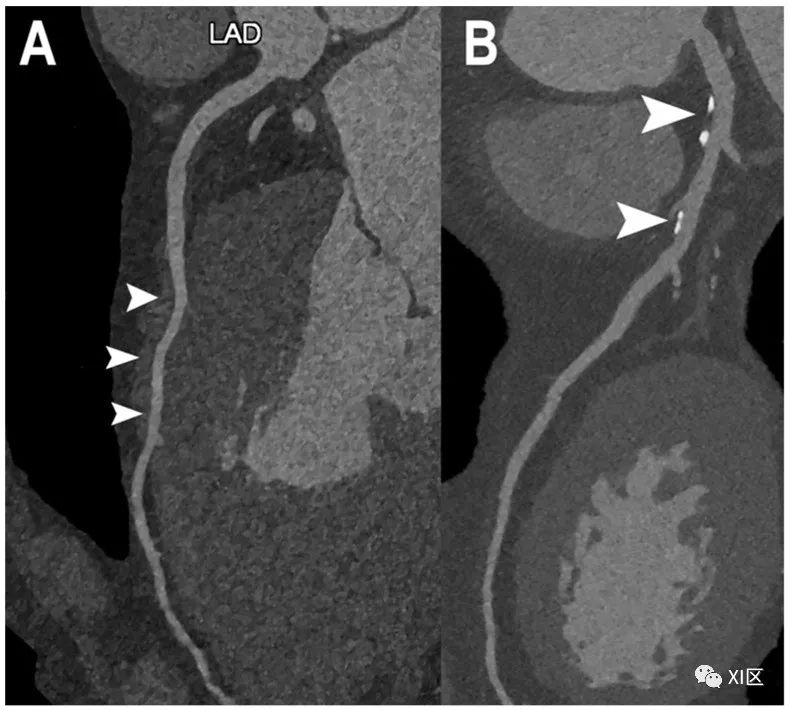 正常和非阻塞性CAD的心脏PCCT示例。图中显示了左前降支(LAD;(A,B))的两个示例。在(A)中,左前降支完全正常,没有任何CAD迹象;唯一的发现是中段((A);箭头)的心内膜走向较深((A))。在(B)中,至少有两个以钙化为主的动脉粥样硬化斑块((B);箭头),但冠状动脉管腔没有任何明显阻塞迹象。使用PCCT进行成像的特别之处在于,这种非常高的细节和空间分辨率是通过标准成像方案获得的,而且不需要高辐射剂量。