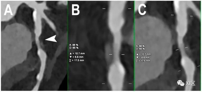 阻塞性CAD的心脏PCCT示例。图中显示的是一个左旋支动脉狭窄的病例,其原因主要是非钙化的动脉粥样硬化斑块,并伴有不明显的正性重构((A);箭头所指)。本例采用0.4mm层厚。对狭窄处的定量评估((B、C);狭窄处的正交纵向视图)显示,管腔直径缩小了65%,管腔面积缩小了 88%。