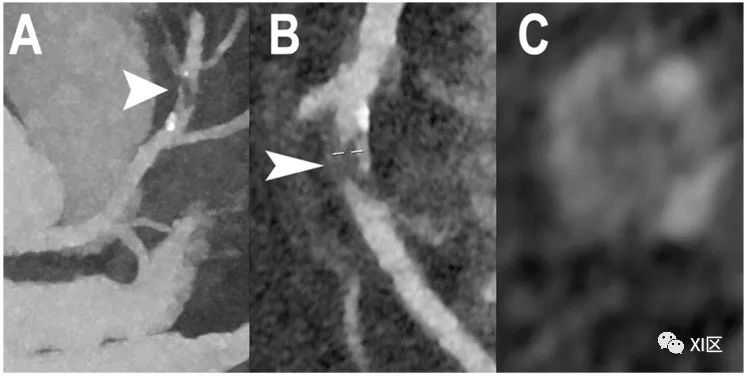阻塞性CAD的心脏PCCT示例。图中显示的是左前降支(LAD)中段(A-C)严重狭窄的示例。斑块((A,B);箭头)主要呈非钙化表型,内核密度较低(C)。本例采用高分辨率模式重建(空间分辨率为100 μm,层厚为0.2 mm)。