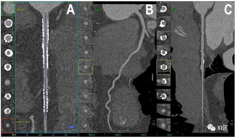 带有多个支架的完整冠状动脉树的心脏PCCT示例。图中显示的是随访时带有多个支架的患者的完整冠状动脉(A-C)。在右冠近端和中段(A)有两个支架,在左缘支(C)有一个支架;左前降支(LAD;(B))正常,没有任何可检测到的动脉粥样硬化疾病。所有支架的内支架和内腔都清晰可见,这在没有传统EID心脏CT上通常不能清晰显示。