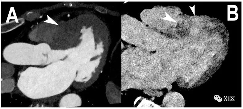 心肌延迟强化的心脏PCCT。本例(A,B)显示的是一名严重肥厚型心肌病患者的三腔投影,患者的左心室基底隔中段受到严重影响((A);箭头)。静脉注射碘基造影剂七分钟后,肥厚左心室壁的碘化CM跨壁聚集(也称为延迟增强)清晰可见((B);箭头)。这一现象与在心脏磁共振中观察到的现象相同,并在临床实践中得到证实。使用PCCT进行这种成像的特别之处在于,能谱成像与标准的心脏CT方案相关,不需要特定的方案。