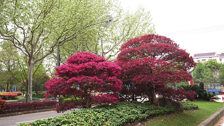 红花檵木为常绿灌木或小乔木,叶暗红色,卵圆形或椭圆形,两面均有星状毛,花紫红色,花瓣4片,带状;喜光,萌芽力强,适应性强。红花檵木枝繁叶茂,姿态优美,在传统园林绿化中常被用于绿篱、模纹花坛、灌木球、桩景造型中,如杨浦周家嘴路的红花檵木球和绿篱、松江人民路的桩景造型。