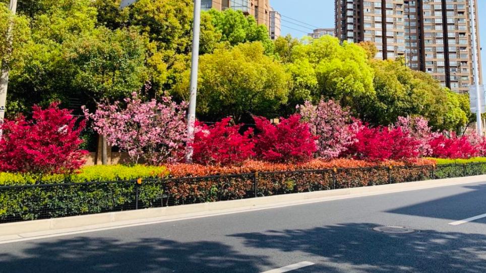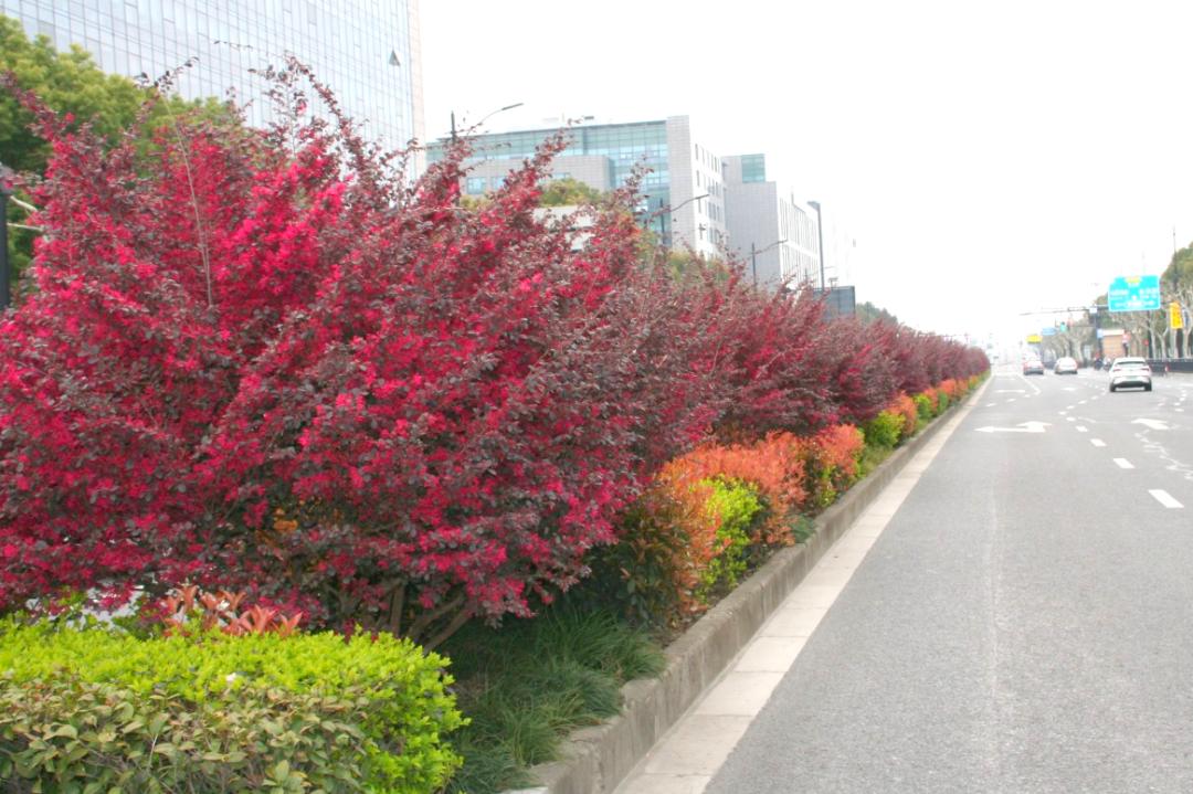 松江人民路近年来,市绿化市容部门积极转变绿化思路,开始让红花檵木等植物自然生长,减少人为干预如整形修剪等养护措施,降低绿化维护成本,同时促进花芽的分化与生长,使红花檵木的枝叶得以自由舒展,开花数量大增。