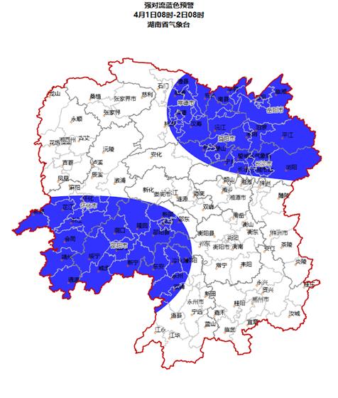 湖南省气象台04月01日08时发布强对流蓝色预警:预计1日08时至2日08时,长沙、邵阳、岳阳、常德东部、益阳东部、永州西北部、怀化将出现8-10级雷暴大风或冰雹天气,并伴有局地短时强降水,请加强防范。
