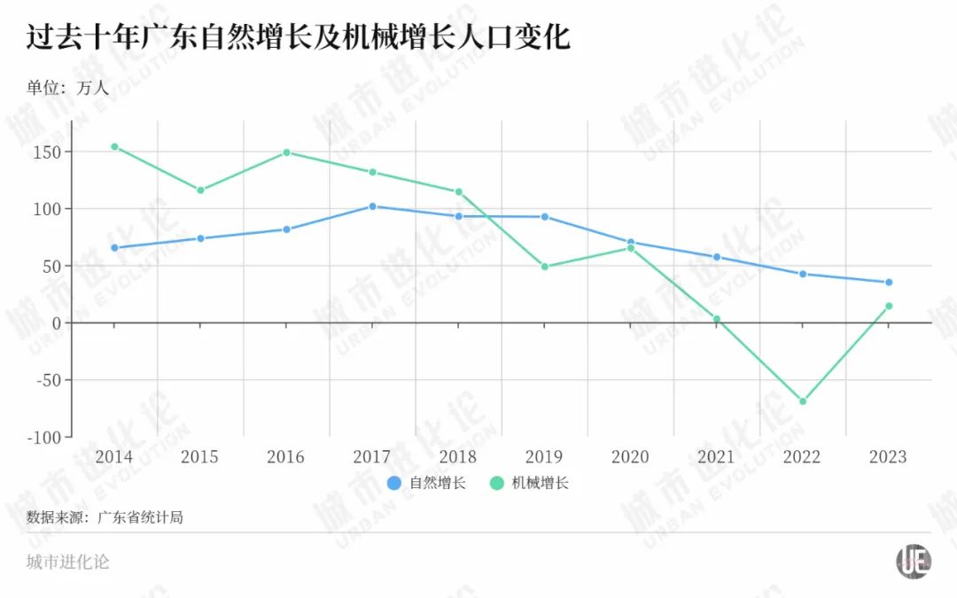 也就是说,广东人口增长的主要矛盾,集中在机械增长——2022年,广东省外流动人口减少69.2万人,彼时广东省统计局官网刊文解释称,这是在2022年广东疫情散发多发的因素影响下,省外流动人口暂时回流返乡的阶段性现象,并预期2023年广东常住人口将逐步恢复稳定增长。