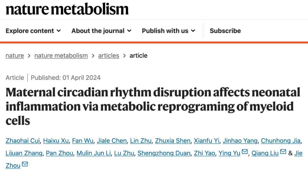 2024年4月1日,天津医科大学周洁教授、刘强教授、余鹰教授等在 Nature 子刊 Nature Metabolism 上发表了题为:Maternal circadian rhythm disruption affects neonatal inflammation via metabolic reprograming of myeloid cells 的研究论文。