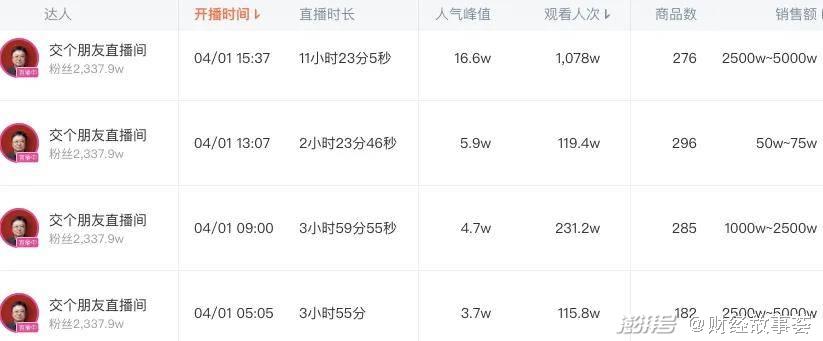 东方甄选也是如此,其在淘宝并没有像抖音那样常态化日播,3月只播了25天,且自3月15开始,其开播时间调整到了下午4点,直播时长远低于抖音16个小时以上的日播时长。