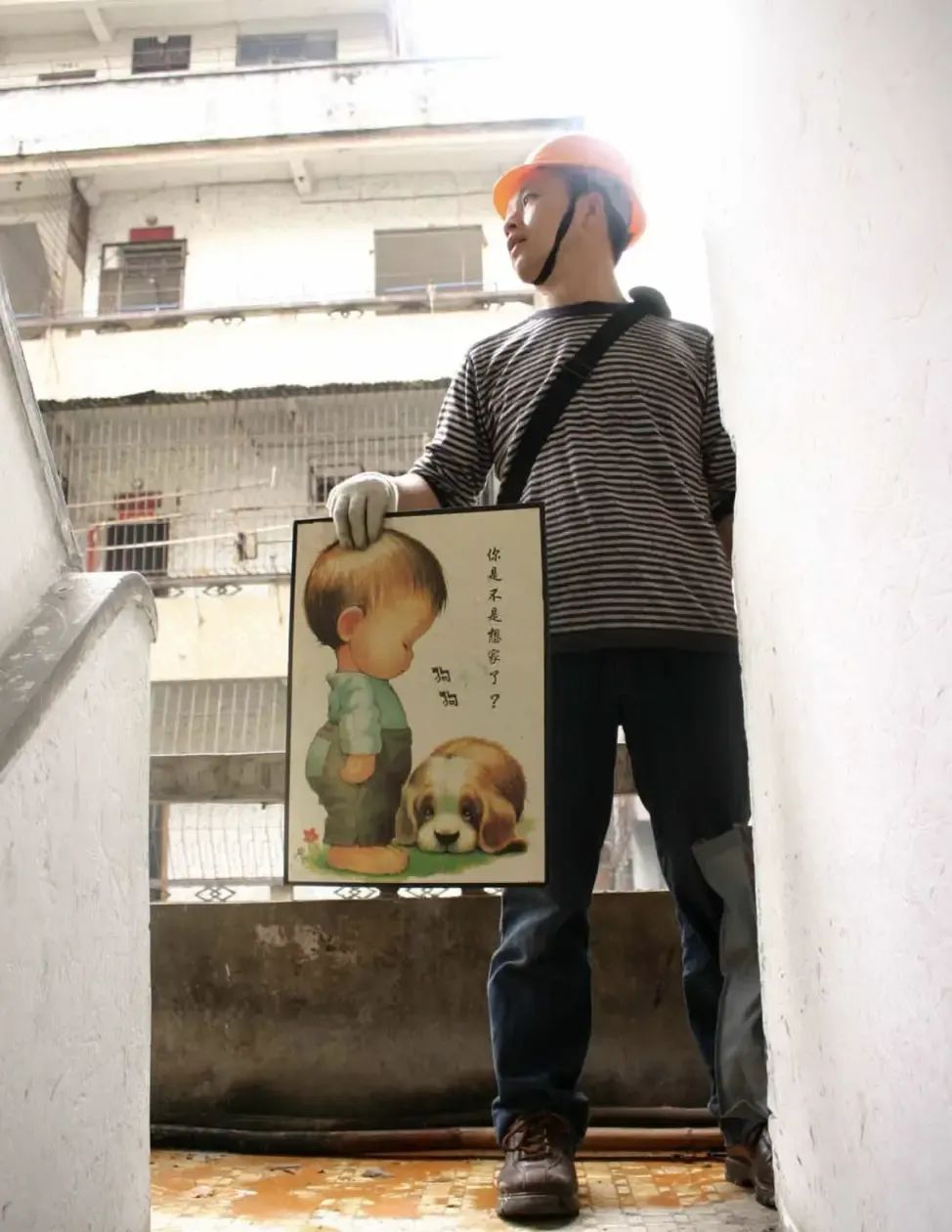在一间间空屋里穿行,陈洲看见没写完的作业本摊在桌子上,上面摆着音乐小熊,还能发出声音。在隐秘的角落,留下了人们的离情别绪。一位外来租户把诀别的话写在门框上:“主人已乘火车去, 林和村一百年不动摇”。照相馆的墙上挂着一幅当年的流行画——一只卡通狗趴在地下,衣服上打补丁的小男孩低头看它,旁白写:“狗狗,你是不是想家了?”
