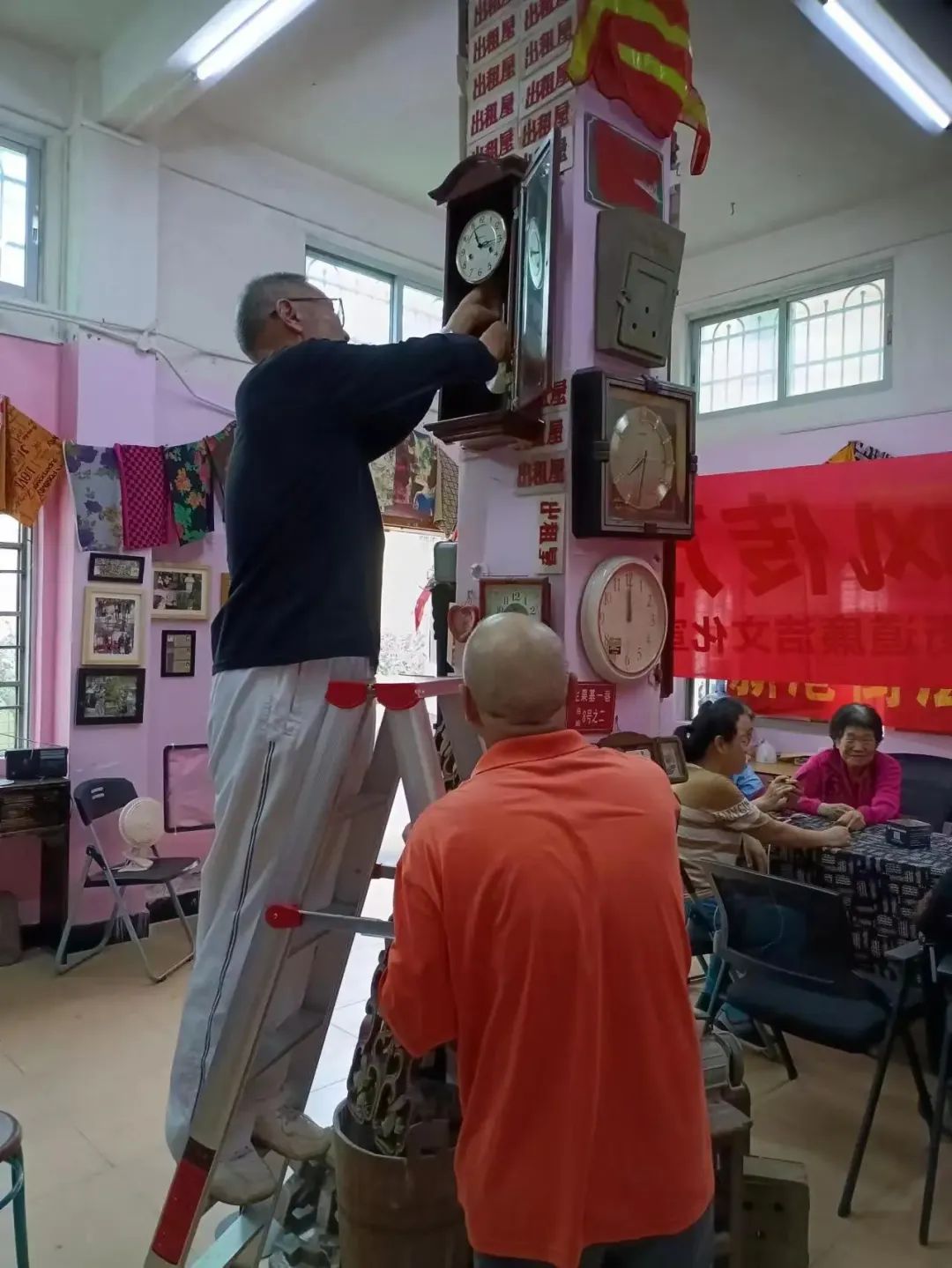 展览吸引了不少附近居民。一位阿叔一直在看挂钟,很是激动,掏出自己随身带的工作证来。原来他之前是广州电子表厂的工人,从23岁干到退休。他迷恋钟,在家里就挂了5个,老婆嫌烦,他送了一个到“博物馆”里。