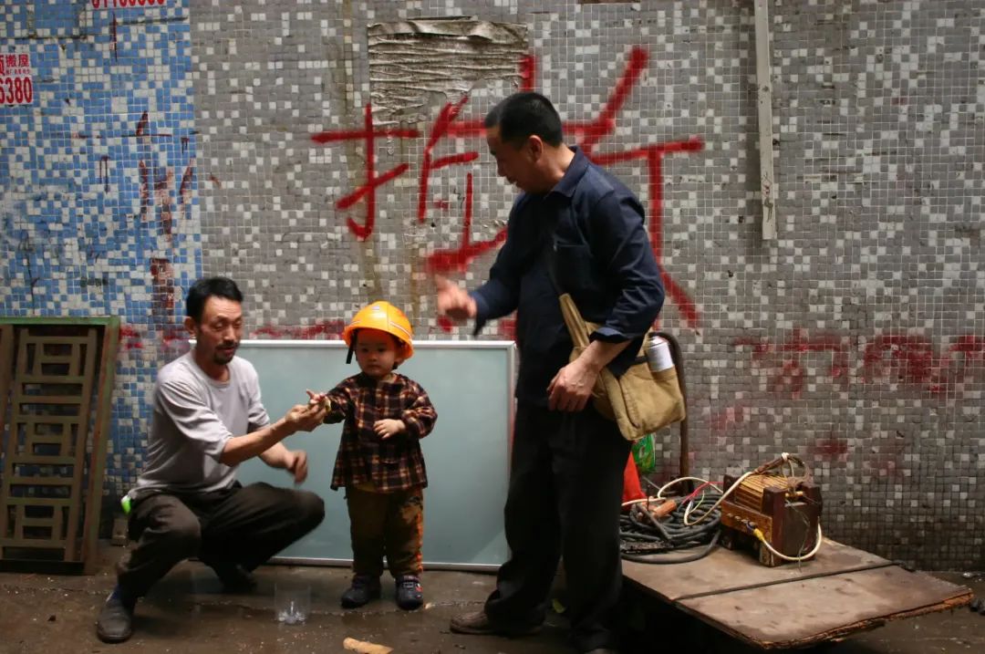 ●林和村搬迁限期将至,两位电焊工负责封锁门窗,一位不知去哪的父亲带着孩子。图为两个电焊工逗孩子玩因为带着相机游荡,陈洲经常被误认是记者。表明身份后,村民倒也不介意他是谁,只是想倾诉。他曾被一个钉子户拦住,那人五十多岁了,在村里当倒插门女婿。拆迁的尾声,一个断水断电的夏天午后,空气和时间也变得粘稠、凝固,他和几条狗住在一起,不停讲述自己的遭遇。