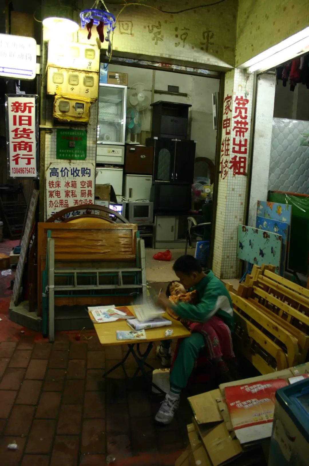 ●冼村,一个男孩抱着熟睡的妹妹,一边做作业一边等待摆摊的妈妈收工