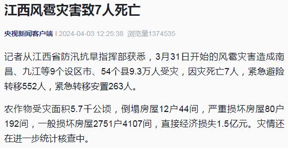 记者从江西省防汛抗旱指挥部获悉,3月31日开始的风雹灾害造成南昌、九江等9个设区市、54个县9.3万人受灾,因灾死亡7人,紧急避险转移552人,紧急转移安置263人。