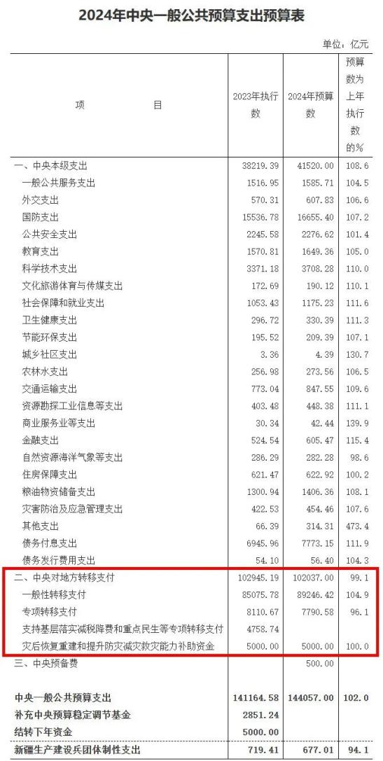 来到2024年,中央对地方转移支付的部分,依旧延续10万亿元的体量。不过,相比上一年10.29万亿元的执行数,转移支付的预算总额略降至10.2万亿元。剔除掉两项一次性因素,同口径增长4.1%。