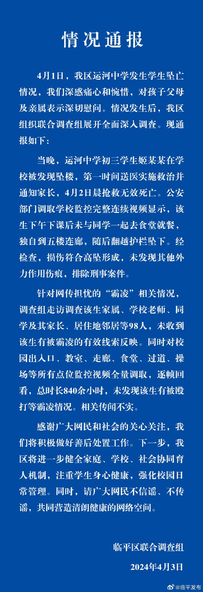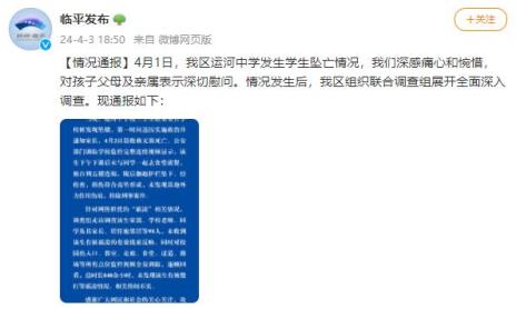 天津广播4月1日,浙江杭州临平区运河中学发生学生坠亡情况,情况发生后,临平区组织联合调查组展开全面深入调查。现通报如下: