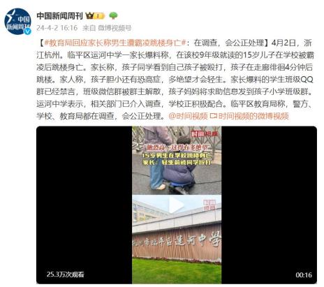 4月2日,浙江杭州临平区运河中学一家长爆料称,在该校9年级就读的15岁儿子在学校被霸凌后跳楼身亡。家长称,孩子同学看到自己孩子被殴打,孩子在走廊徘徊4分钟后跳楼。家人称,孩子胆小还有恐高症,多绝望才会轻生。家长爆料的学生班级QQ群已经禁言,班级微信群被群主解散,孩子妈妈将求助信息发到孩子小学班级群。运河中学表示,相关部门已介入调查,学校正积极配合。临平区教育局称,警方、学校、教育局都在调查,会公正处理。