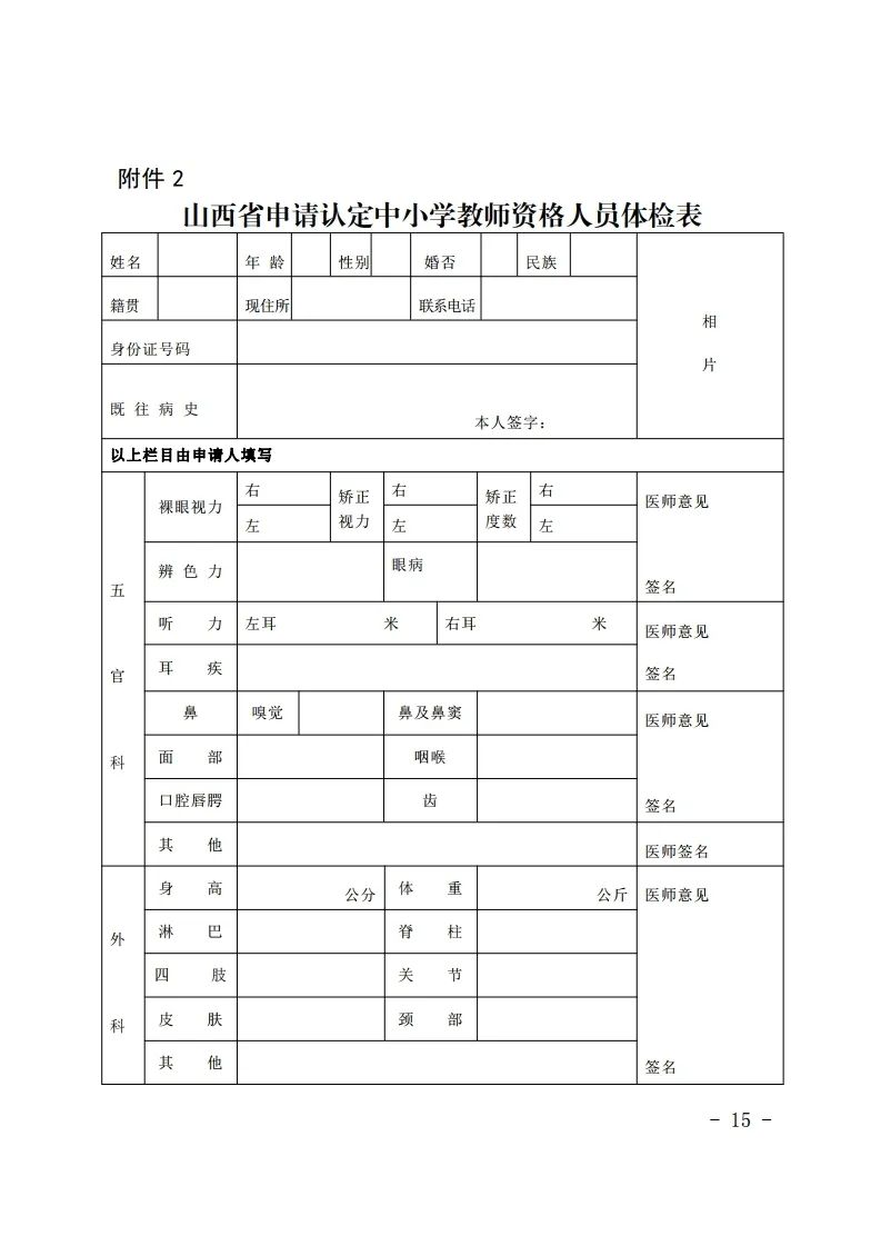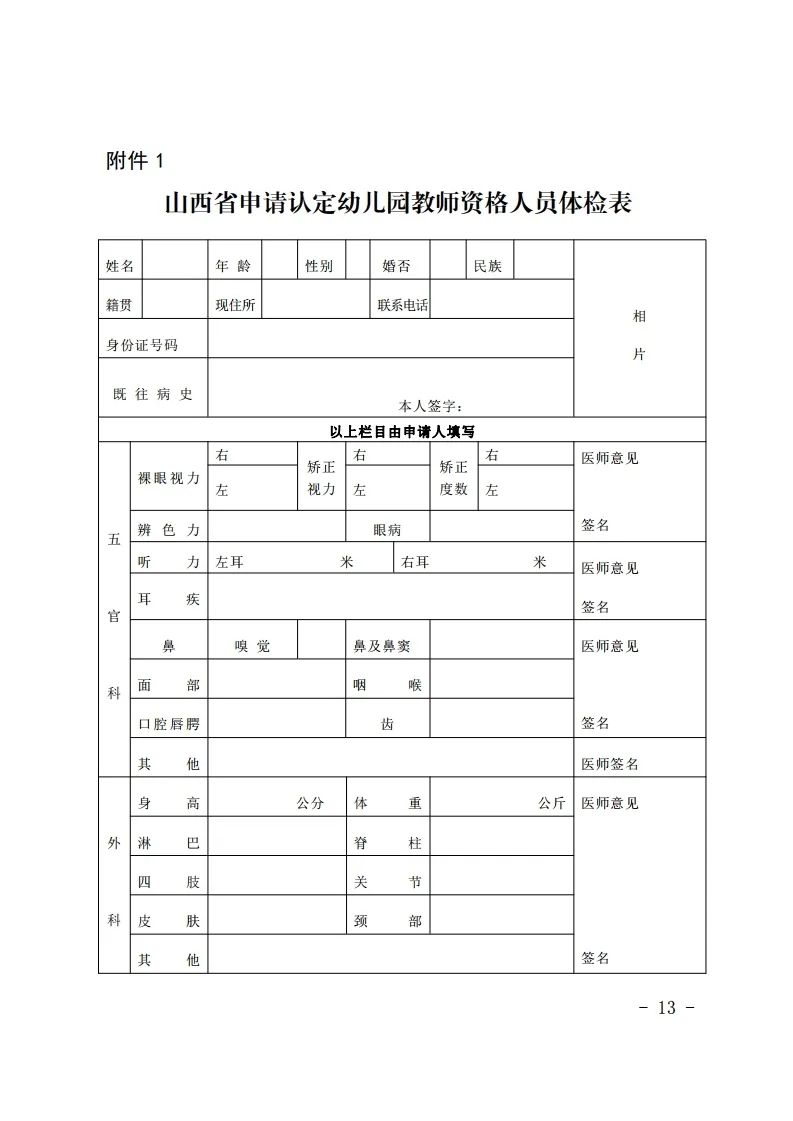 1.山西省申请认定幼儿园教师资格人员体检表