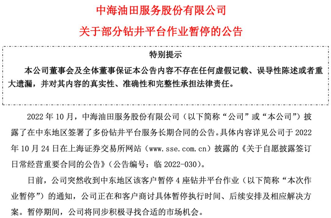 4月3日晚间,中海油服公告称,2022年10月,公司披露在中东地区签署了多份钻井平台服务长期合同的公告。日前,公司突然收到中东地区该客户暂停4座钻井平台作业的通知,公司正在和客户商讨具体暂停执行时间、后续安排及相应解决方案。暂停期间,公司将同步积极寻找合适的市场机会。