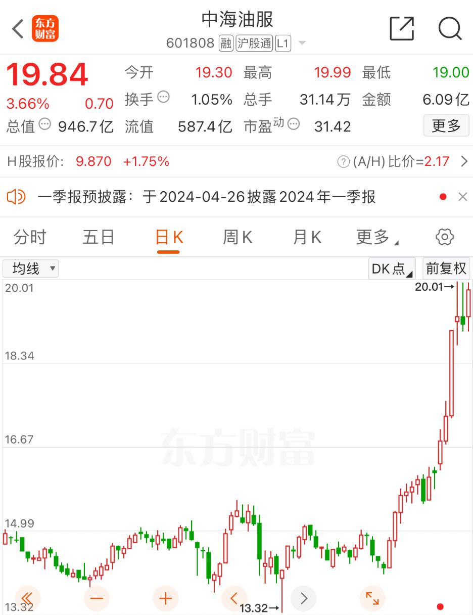 截至4月3日收盘,中海油服A股股价报19.84元,年内涨幅达35.7%,H股报9.87港元,最新总市值(分别计算A股、H股的市值后加总)约为750亿元。