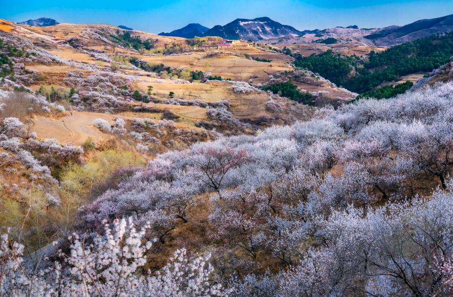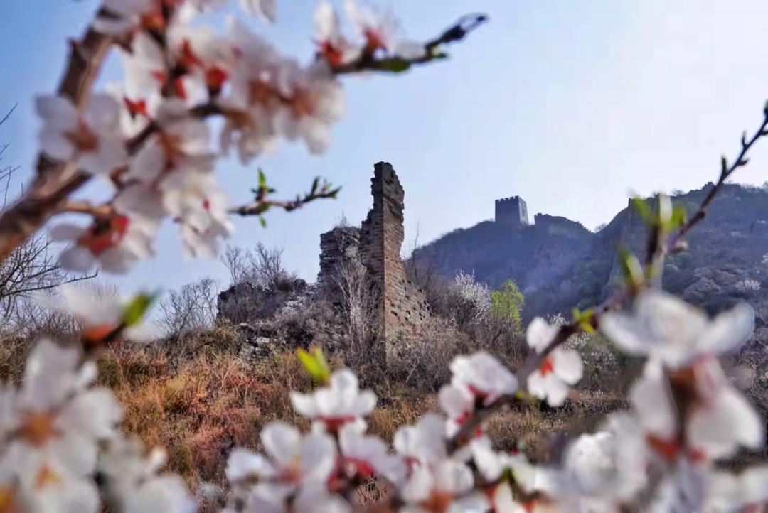 秦皇岛长城附近多生长着野山杏,春风一吹,长城内外杏花竞相开放,白里透着点点微红,一树树热烈的绽放。像是山际间飘来一团团浅粉色的云雾。