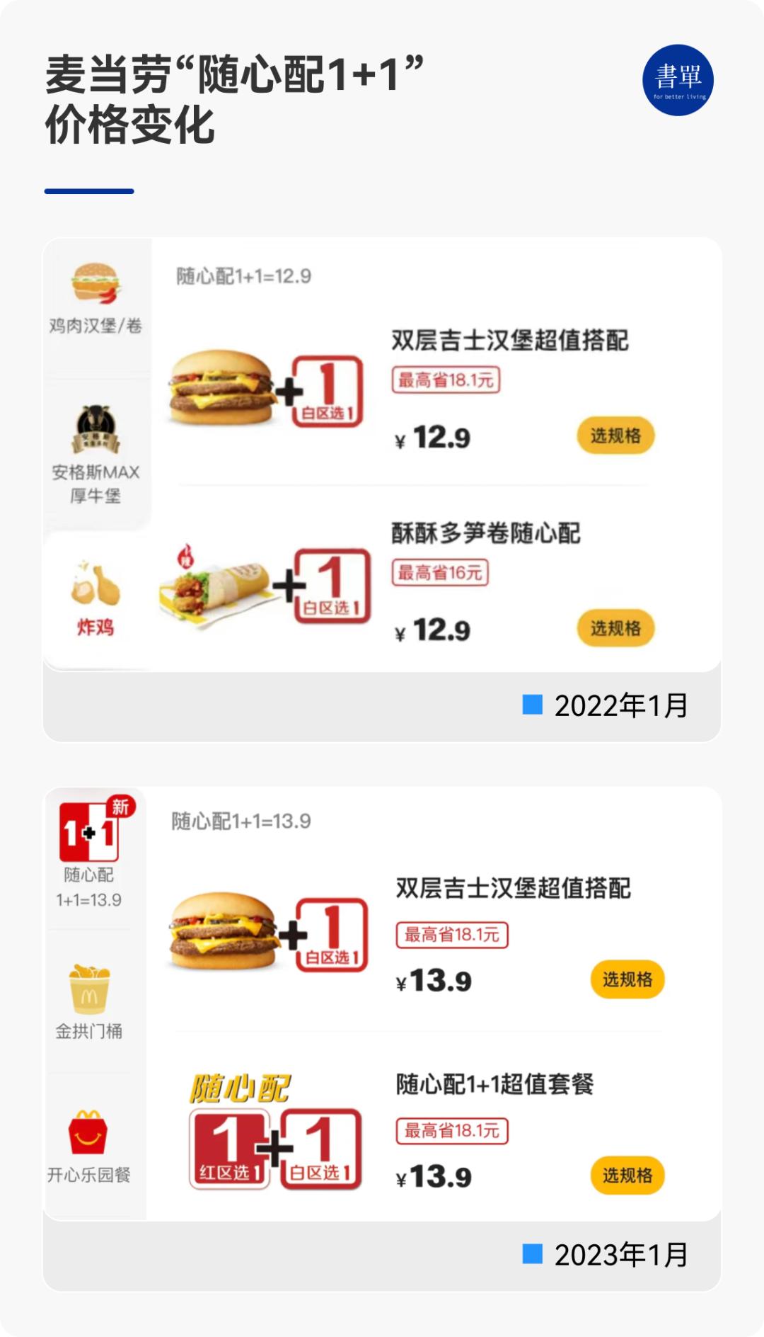 2021年12月,“随心配1+1”从12元涨到了12.9元;2022年12月,麦当劳早餐套餐、薯条、汉堡都有了0.5元到2元的涨价。