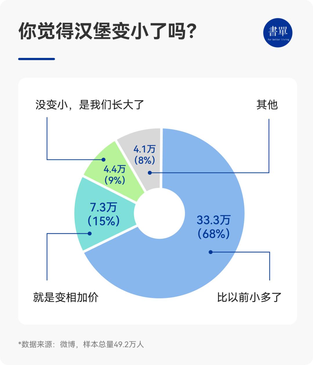 微博上曾有一个“你觉得汉堡变小了吗?”的投票,有49.2万网友参加,其中33.3万认为“比以前小多了”,7.3万认为“就是变相加价”,只有不到9%的投票网友认为“没变小,是我们长大了”。