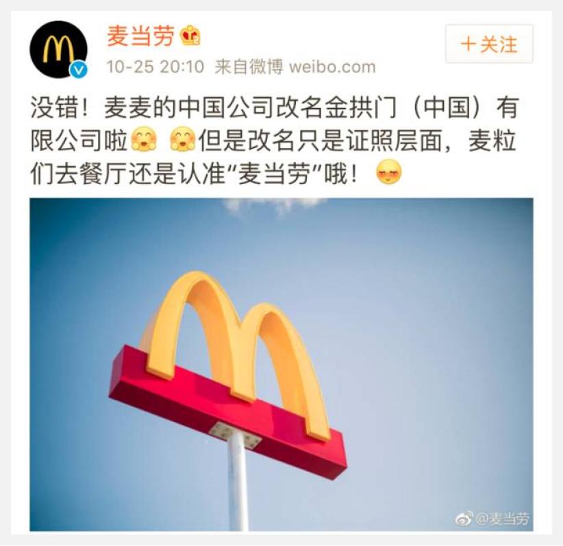 当时还出了一个新闻,麦当劳中国公司的注册名字变成了“金拱门”,“麦当劳=金拱门”的梗也由此诞生。